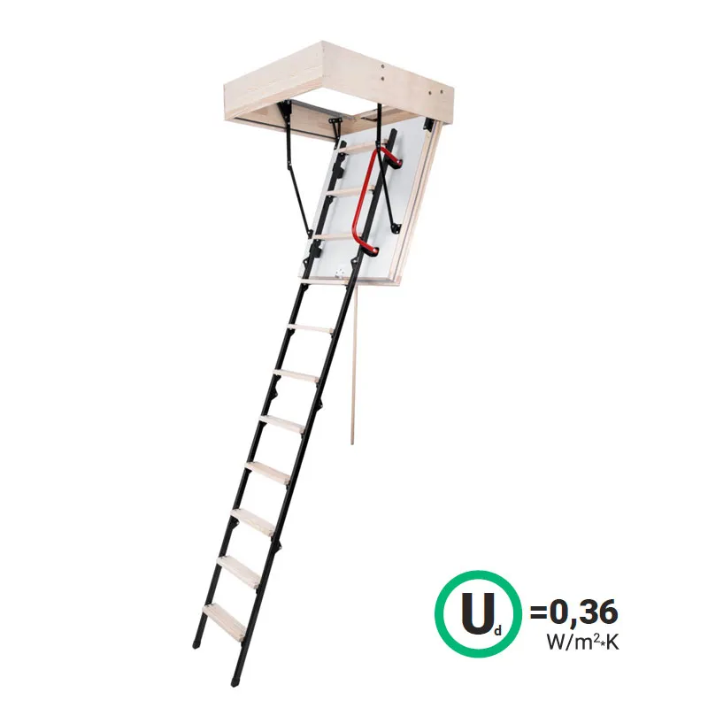 Складная 4-х секционная чердачная лестница. Ступени выполнены из сосны, имеют противоскользящие насечки, направляющие из металла.