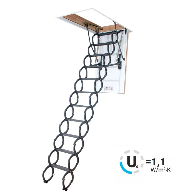 Складная 4-х секционная чердачная лестница. Рабочая поверхность полностью выполнена из алюминия. Термоизоляционная крышка типа "сэндвич" имеет усиленную теплозащиту, облицована с двух сторон ДВП белого цвета. По контуру короба имеется уплотнитель; Все металлические элементы лестницы покрыты порошковой краской.