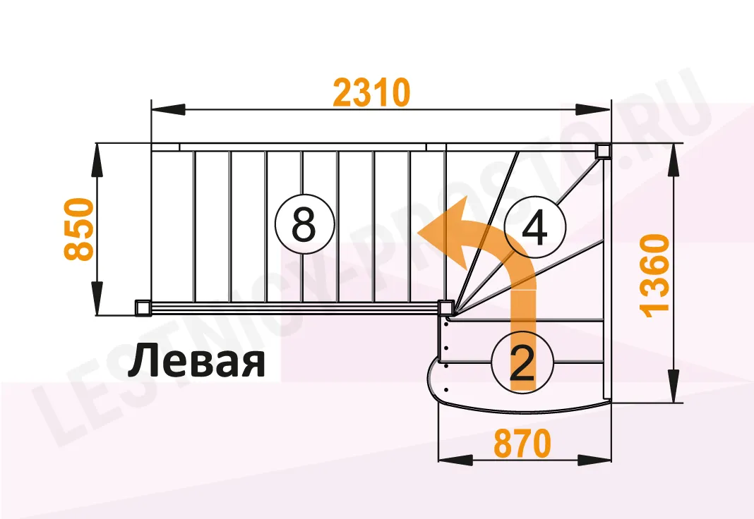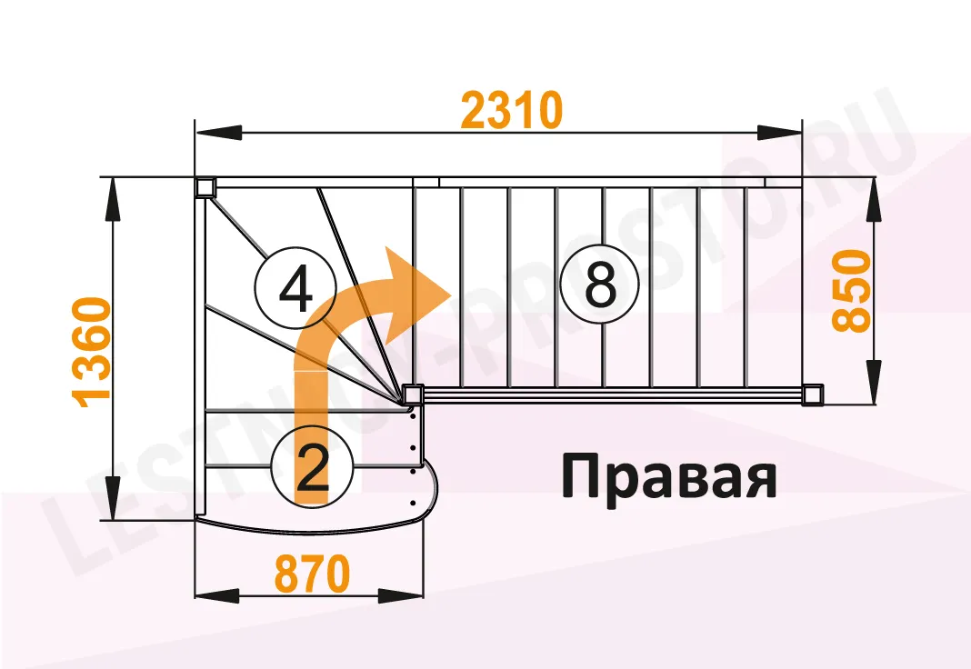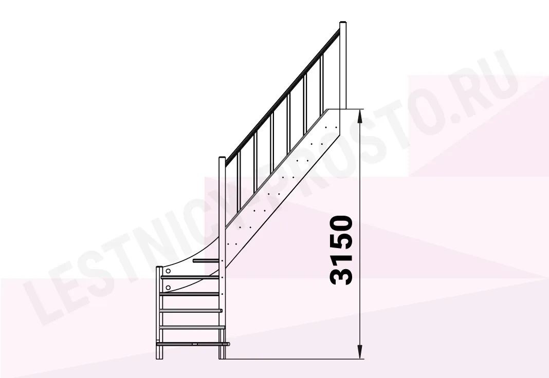 Ступени и поручень лестницы изготовлены из дуба, остальные элементы из сосны. Возможно изготовление данной модели полностью из дуба. Базовый комплект включает в себя деревянные элементы лестницы и ограждения без какого-либо покрытия.