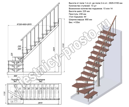 Лестница PROSTO MONO Г-образная h315 см, ступени хвоя