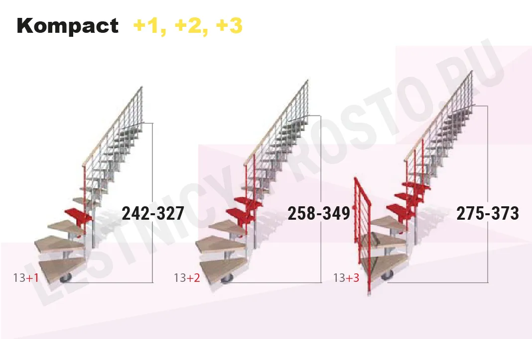 Красивая комфортная лестница с уникальной модульной конструкцией, которая позволяет собрать большое число модификаций, подходящих под ваш проём и другие условия помещения. Возможные варианты сборки лестницы смотрите в блоке "чертежи и схемы". При монтаже модульной лестницы KOMPACT, вы можете варьировать высоту шага и проступь, получив точную необходимую высоту и габариты. Ступени выполнены из массива бука и покрыты качественным износостойким лаком. Базовая комплектация позволяет получить лестницу под высоты этажа в диапазоне 2250 - 3030 мм, кроме того, установив дополнительный комплект увеличения высоты, можно поднять высоту лестницы до 3730 мм. Каркас и стойки ограждения выполнены из пластифицированного металла.