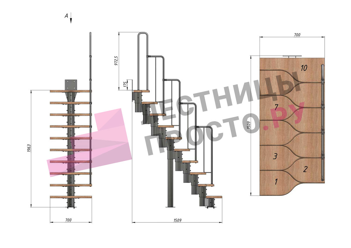 Лестница Prosto Urban Black гусиный шаг 700 мм, h180-264 см (10 ступеней), дуб
