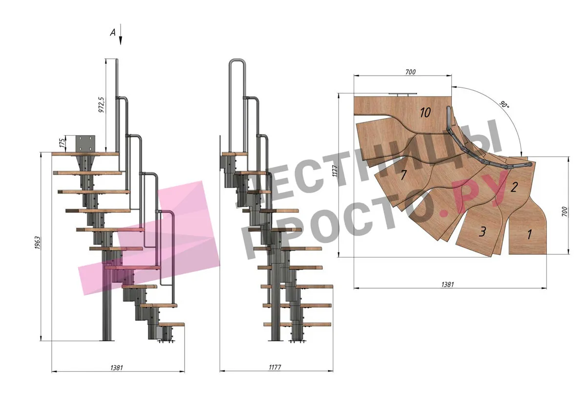 Лестница Prosto Urban White гусиный шаг 700 мм, h180-264 см (10 ступеней), дуб