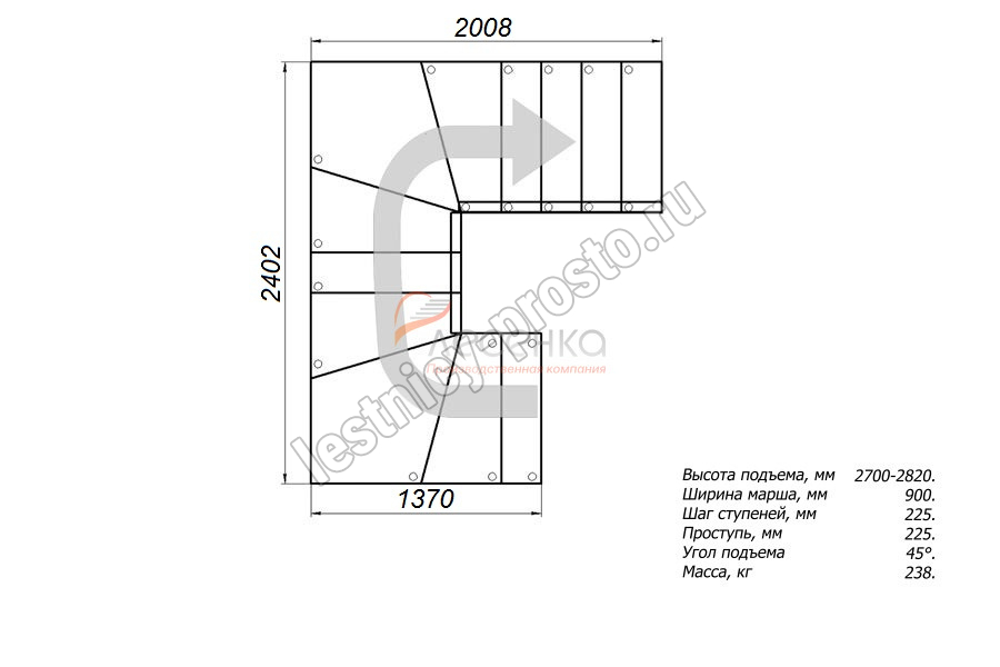 Модульная лестница Спринт 225 2700-2820, Серый, Сосна, Нержавеющая сталь