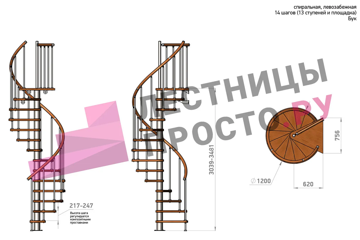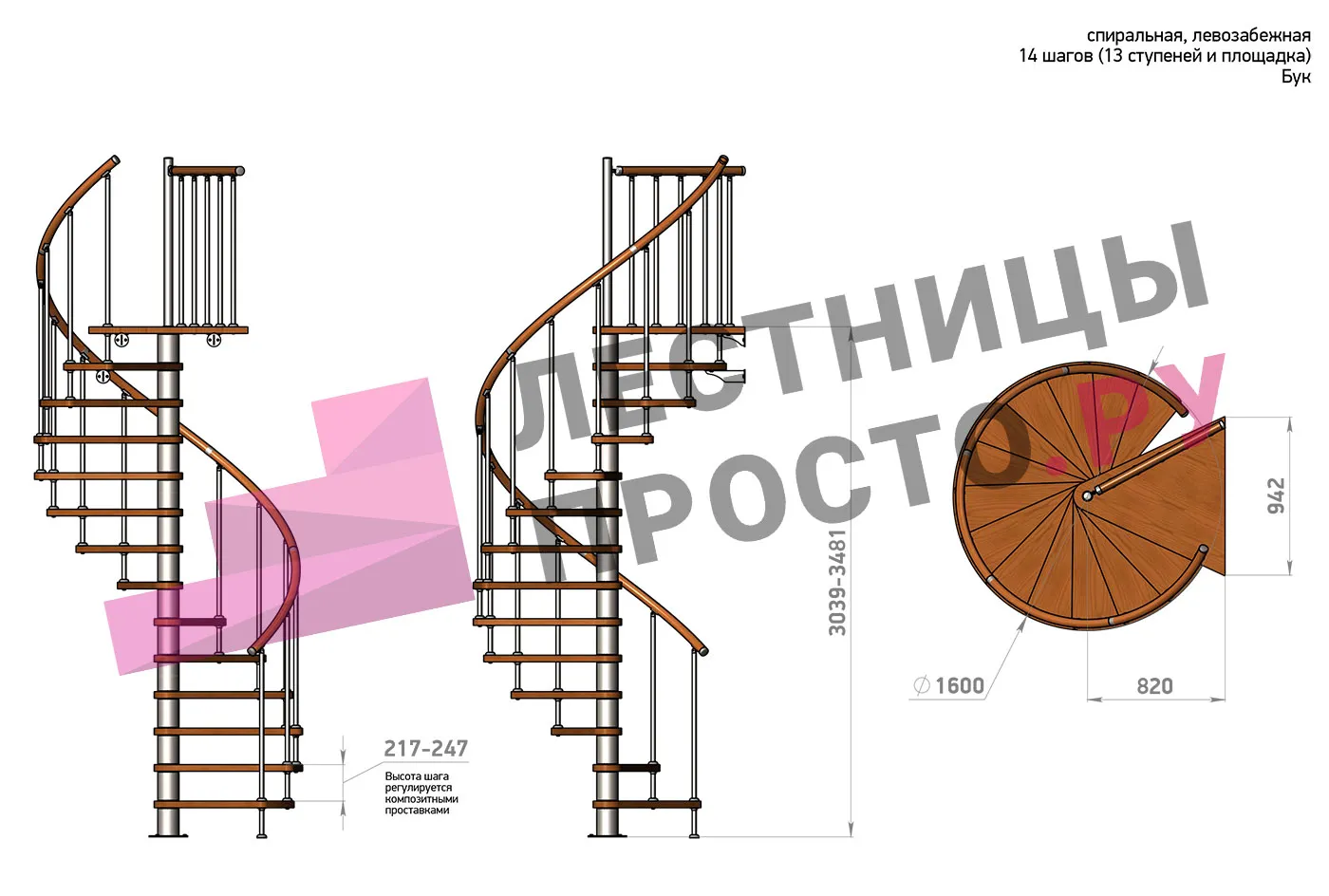 | Винтовая лестница Prosto Spiral Black D140см, h260.5-304.6 см, бук |