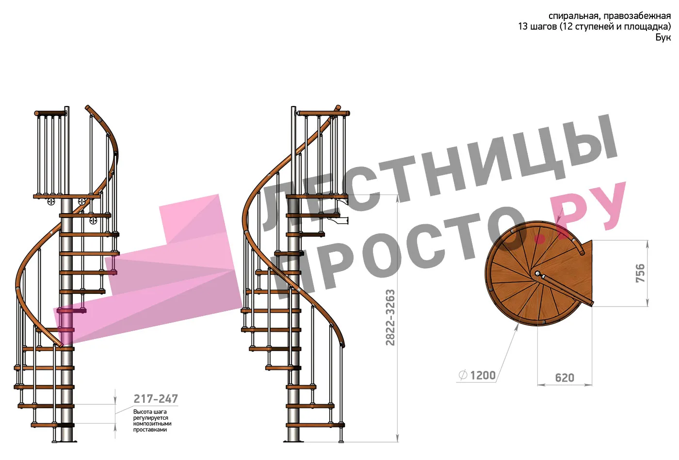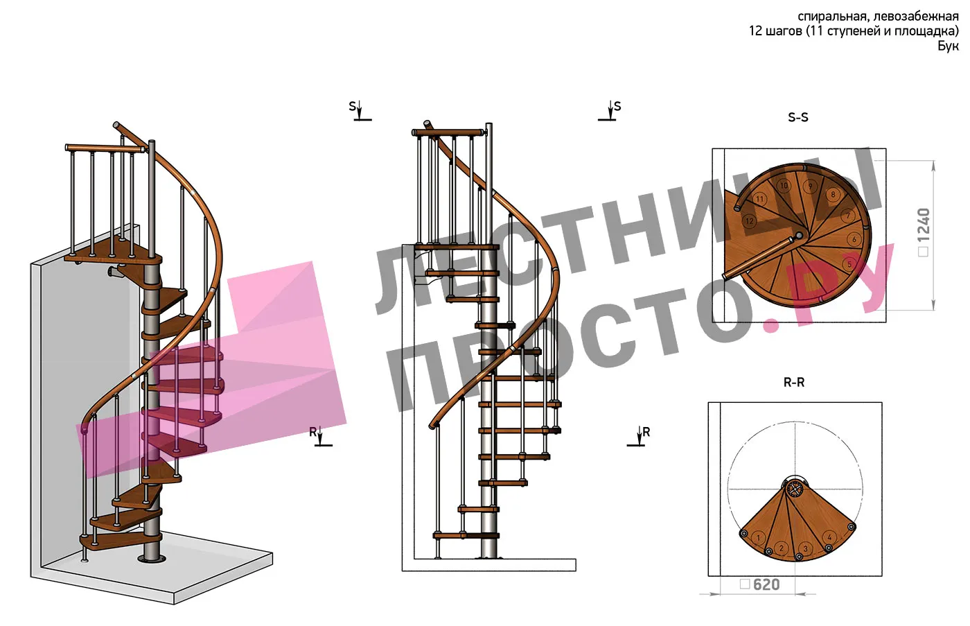 | Винтовая лестница Prosto Spiral Black D120см, h282.2-326,3 см, бук |