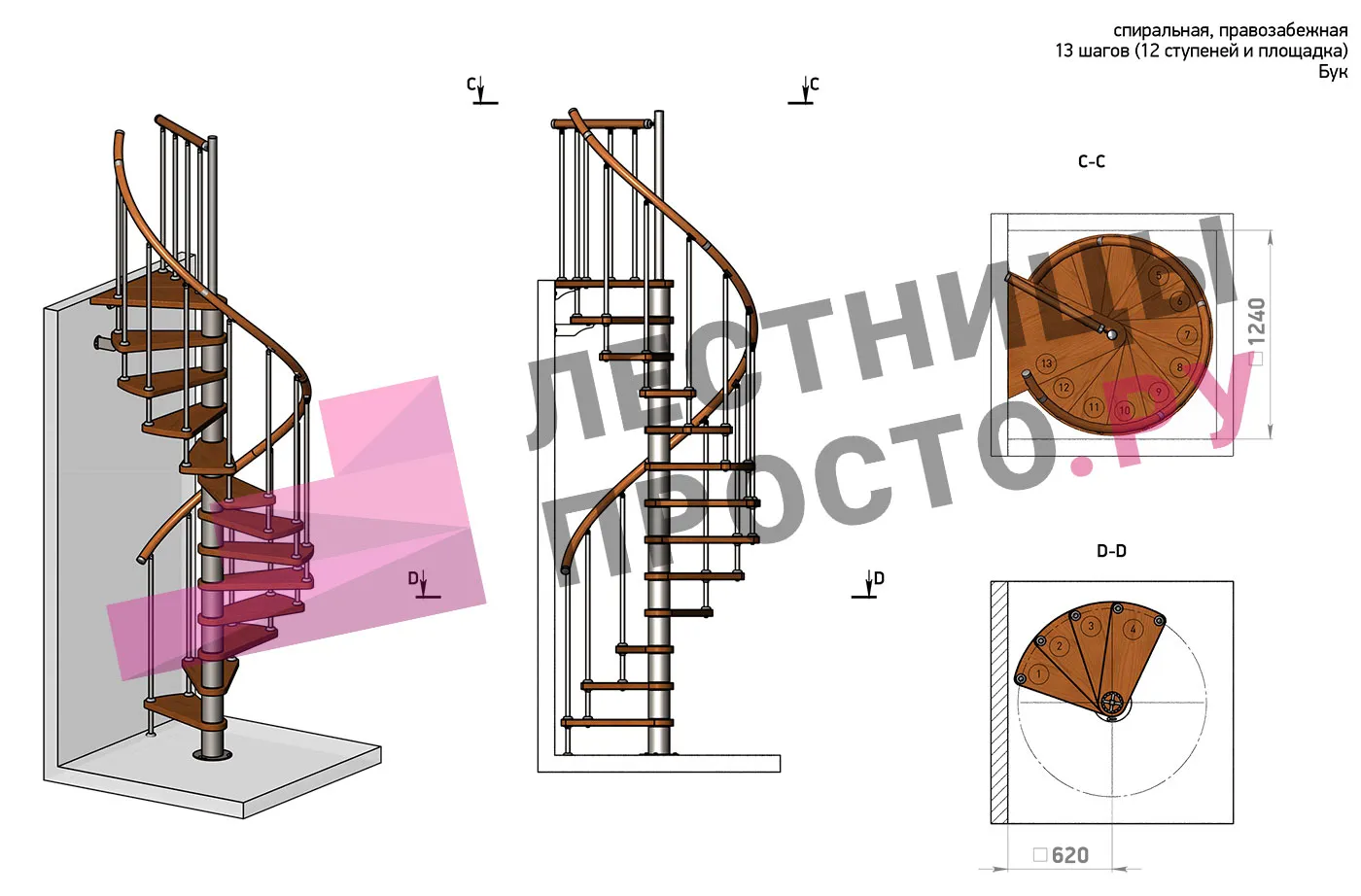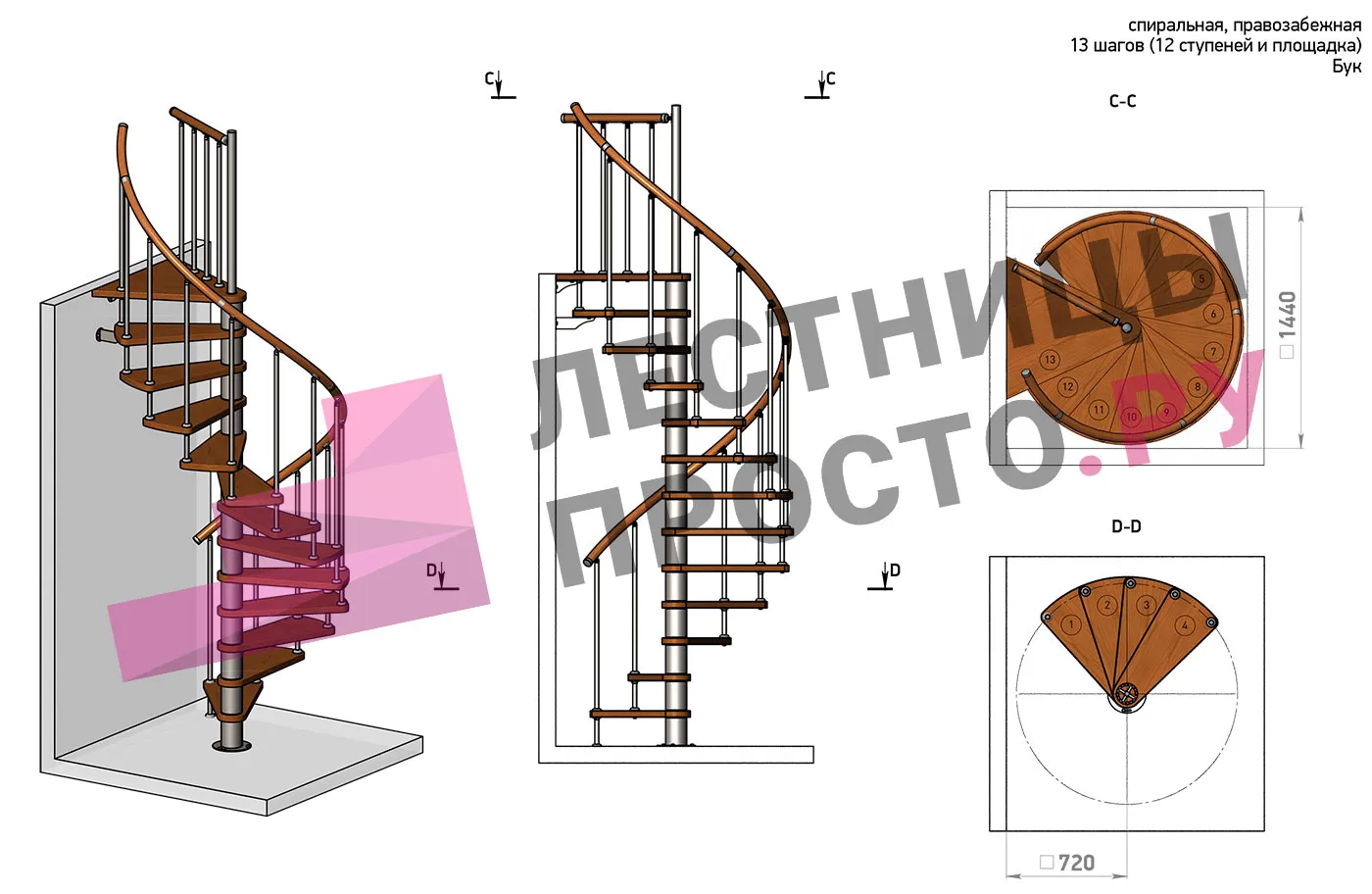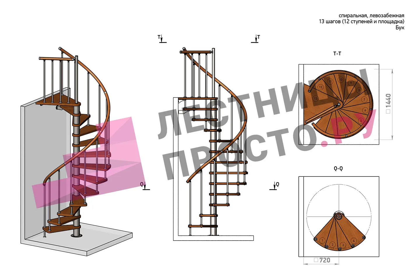 | Винтовая лестница Prosto Spiral Black D140см, h303.9-348,1 см, бук |
