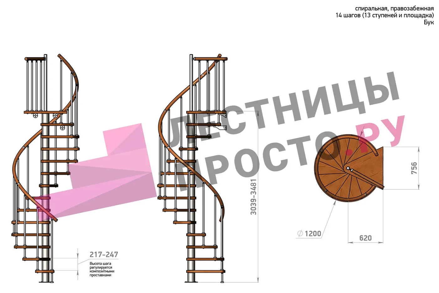 Ширина ступени между стойками и центральной колонной ≈ 48 см