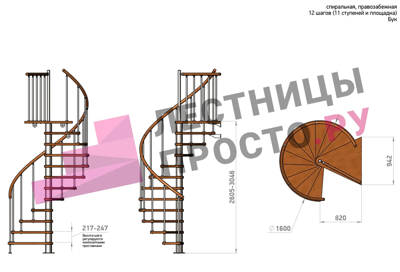 Правая, d=160см, 11 ступеней + площадка