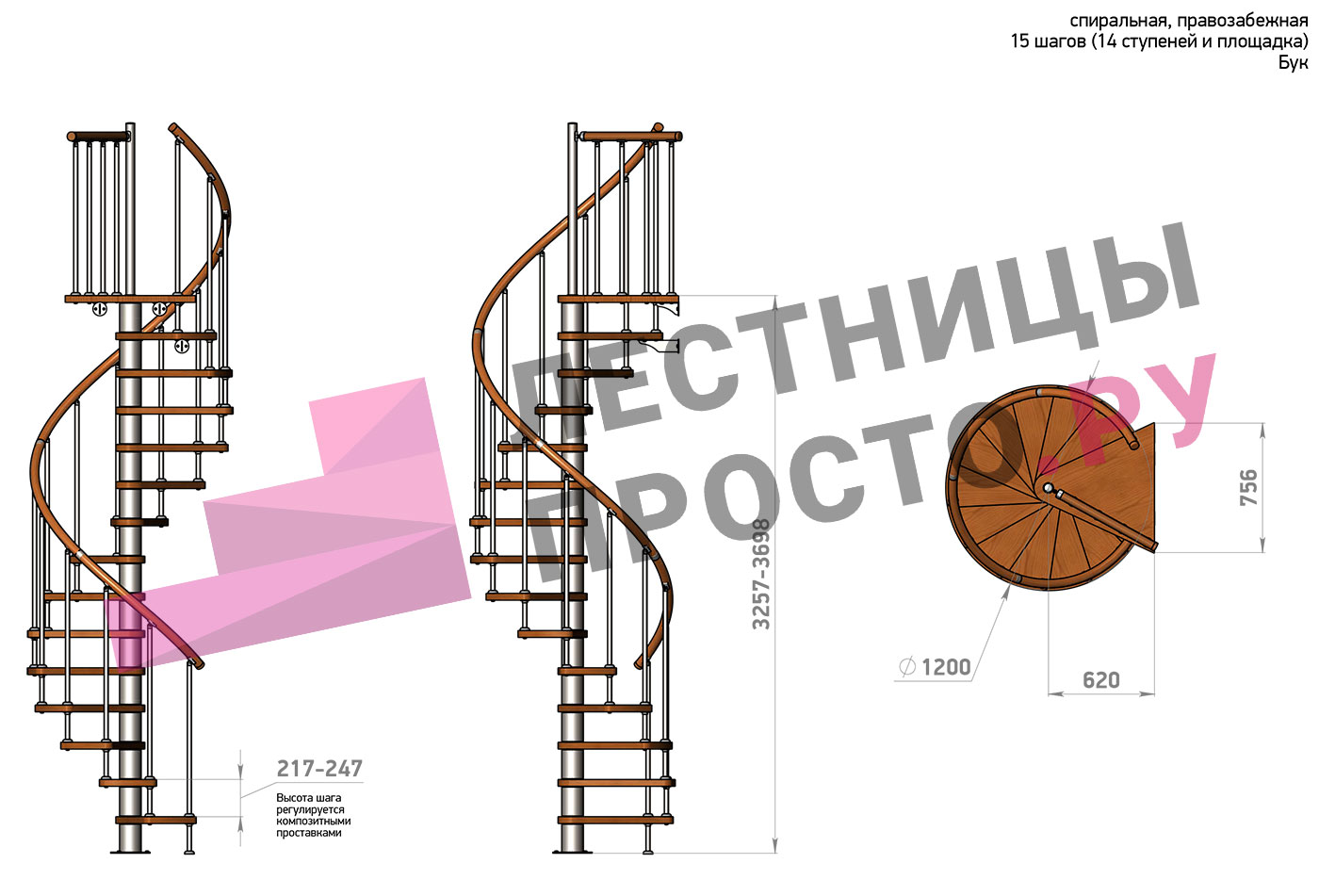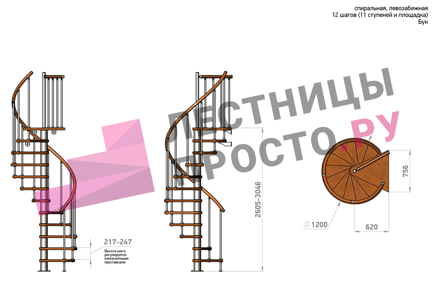 Винтовая лестница Prosto Spiral White D120см, h260.5-304.6 см, бук |