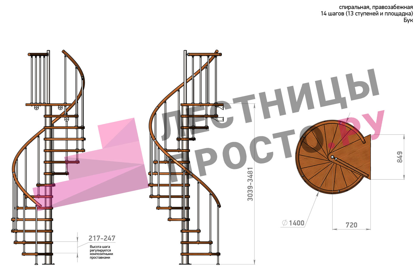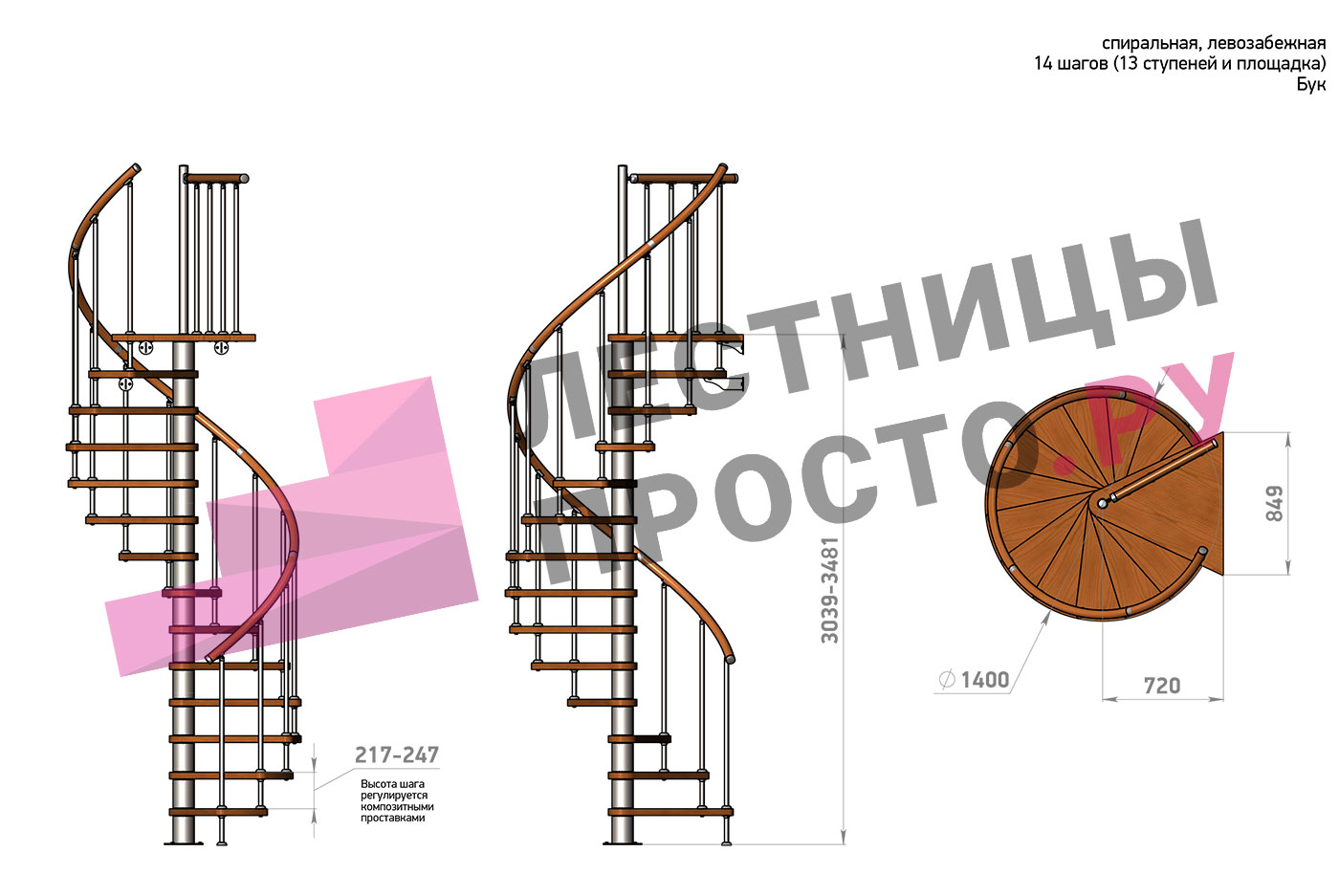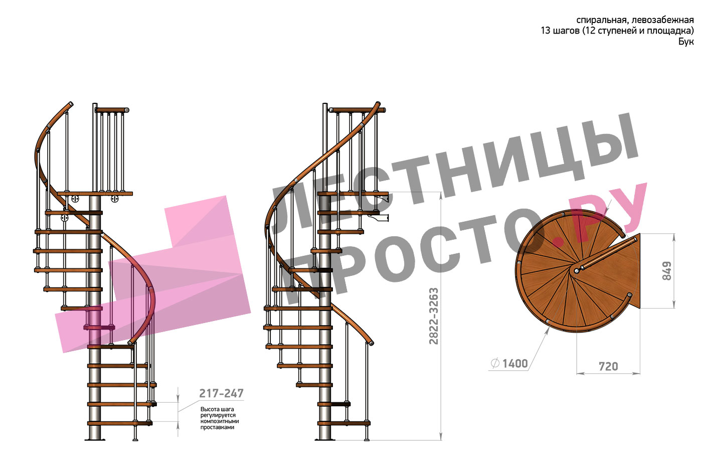Винтовая лестница Prosto Spiral White D140см, h260.5-304.6 см, бук |