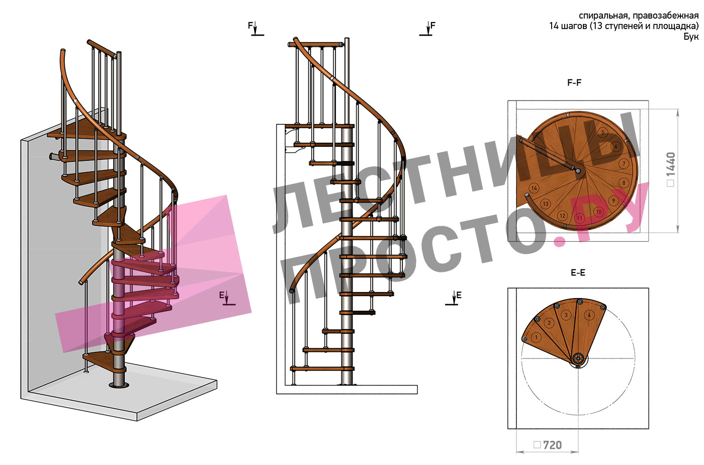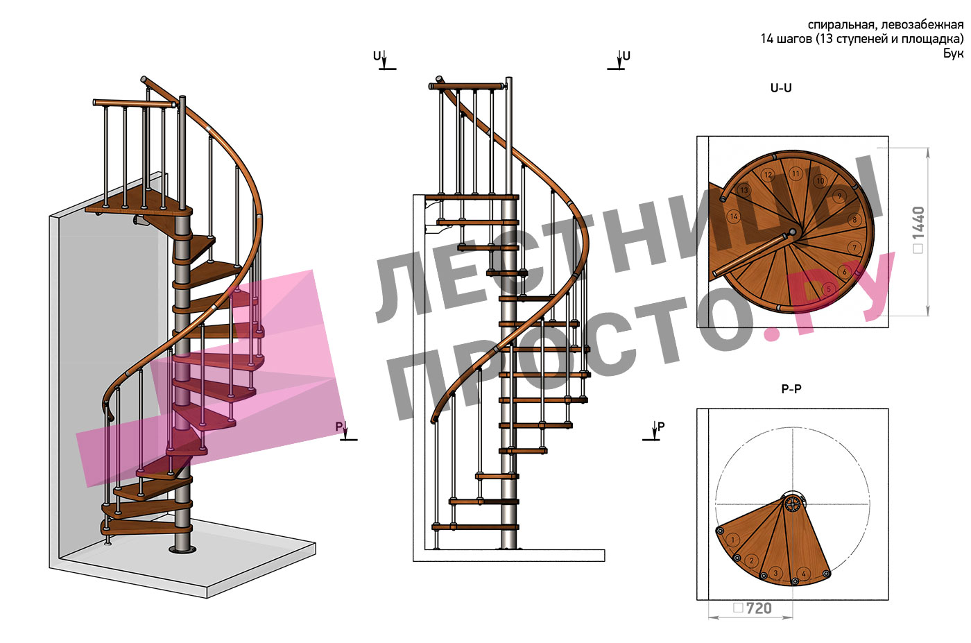 Винтовая лестница Prosto Spiral White D140см, h303.9-348,1 см, бук |