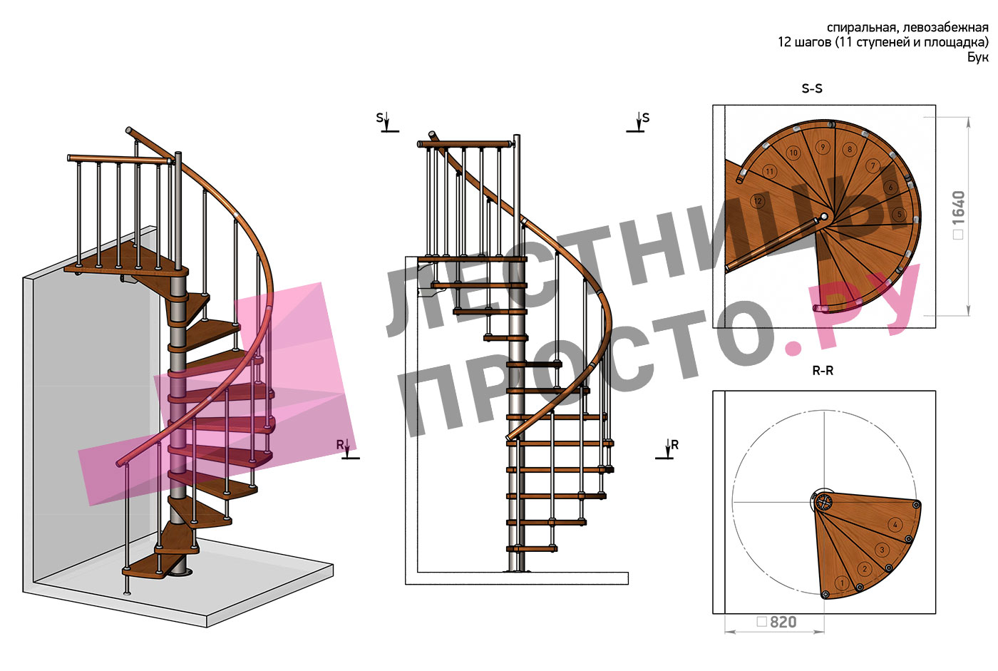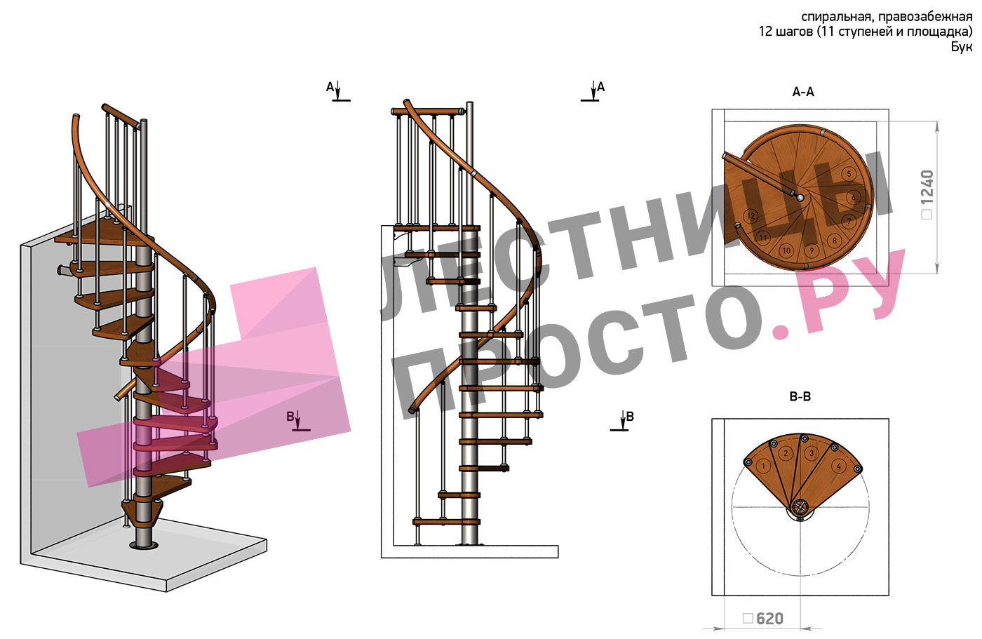 Винтовая лестница Prosto Spiral White D120см, h325.7-369.8 см, бук |